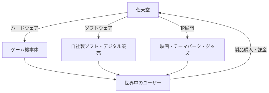 任天堂は、単なる「ゲーム機を作っている会社」ではありません。自社でゲーム機(ハード)を作り、その中で遊ぶゲーム(ソフト)も作り、さらにそのキャラクター(IP)を様々なビジネスに展開する、強力なエコシステムを持っています。
