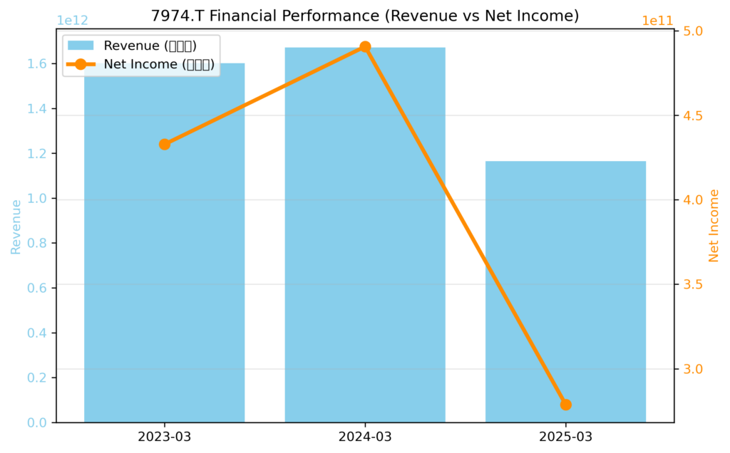 業績データ(財務推移)を見ると、その理由が見えてきます。 直近の2025年3月期は、売上高が約1.16兆円、純利益が約2,788億円と、前年(売上1.67兆円、純利益4,906億円)から大幅な減収減益となっています。 これは、大ヒットした「Nintendo Switch」が発売から年月が経ち、ハード・ソフトともに販売サイクルが終盤(末期)に差し掛かっていることが主な要因です。